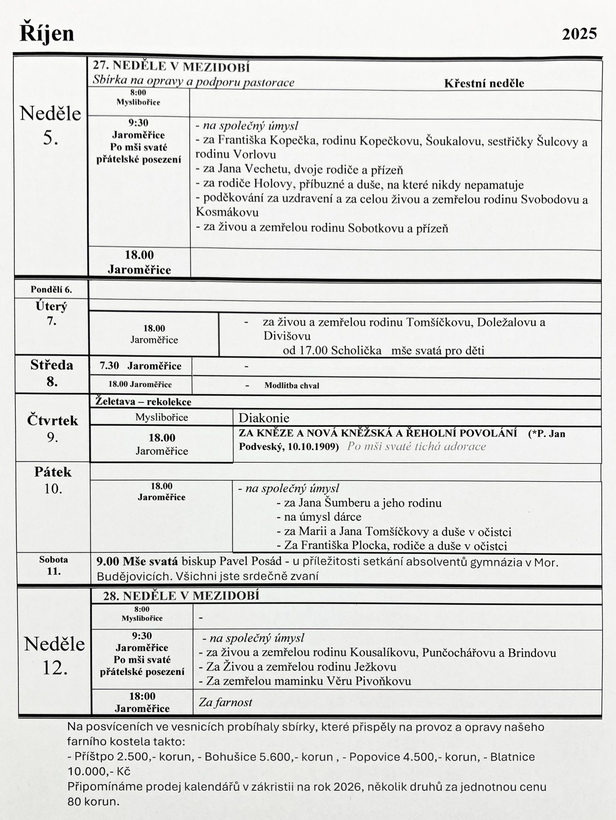 Úmysly pro mše svaté.